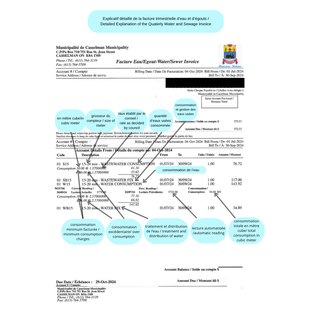 The Municipality of Casselman uses water meters to bill users according to the volume of water they use. The volume of wastewater is based on the volume of drinking water consumed. The unit of measurement is the cubic metre, equivalent to 1,000 liters.
